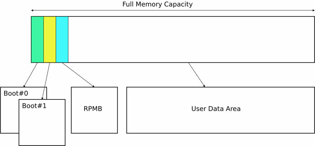 and you connect to a normal micro SD card reader, you will see only partitions on “User Data Area” which normally contains BootFS and RootFS! You will never see partitions Boot#0, Boot#1 and RPMB!